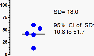 The standard deviation computed from the five values shown in the graph above is 18.0. But the true standard deviation of the population from which the values were sampled might be quite different. Since N=5, the 95% confidence interval extends from 10.8 (0.60*18.0) to 51.7 (2.87*18.0). When you compute a SD from only five values, the upper 95% confidence limit for the SD is almost five times the lower limit.