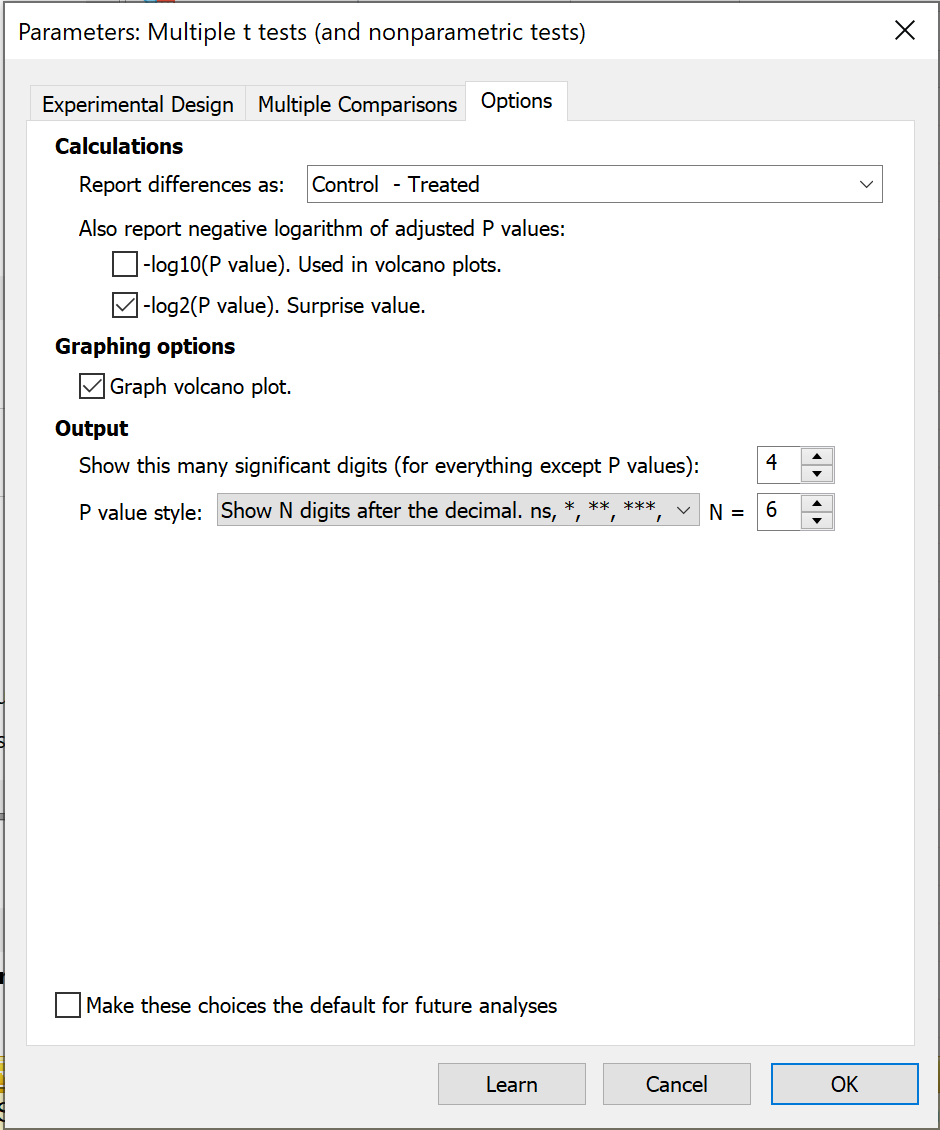 The third and final tab on the Parameters: Multiple t test (and nonparametric tests) analysis dialog provides a number of important controls for setting up how the results of the analysis will be reported and what sorts of visualizations Prism will generate from this analysis.