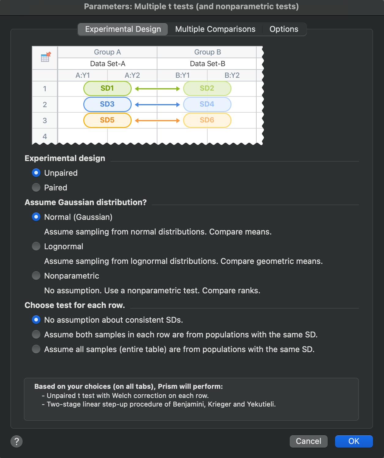 oThe first choice makes no assumptions about the geometric standard deviations of the populations from which the data in any row or column were sampled from. By selecting this option, Prism will perform the lognormal t test with Welch's correction for each row. For unpaired data sampled from a lognormal distribution, this should likely be your default choice.