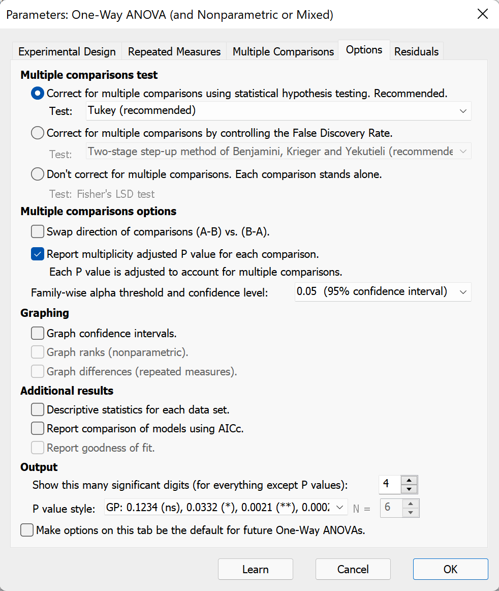 If you choose the Bonferroni, Tukey or Dunnett multiple comparisons test, Prism can also report multiplicity adjusted P values. If you check this option, Prism reports an adjusted P value for each comparison. These calculations take into account not only the two groups being compared, but the total number groups (data set columns) in the ANOVA, and the data in all the groups. With Dunnett's test, Prism can only report a multiplicity adjusted P value when it would be greater than 0.0001. Otherwise it reports "<0.0001" (prior to Prism 8, Prism reported 0.0001 without the less-than symbol).