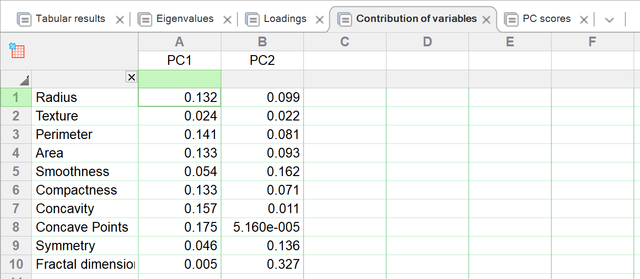 The contribution matrix of variables indicates which variables ‘contribute’ overall to the calculation of the PCs. Each row represents one variable, and each column represents one PC. Only PCs that were selected by the chosen selection method are displayed in this table. The values in a single column represent the fraction of total variance explained by that PC that each variable contributes. As such, these values sum to 1.0 (100% of the variance explained by the PC). Numerically, these values are the square of the corresponding values in the eigenvectors table.