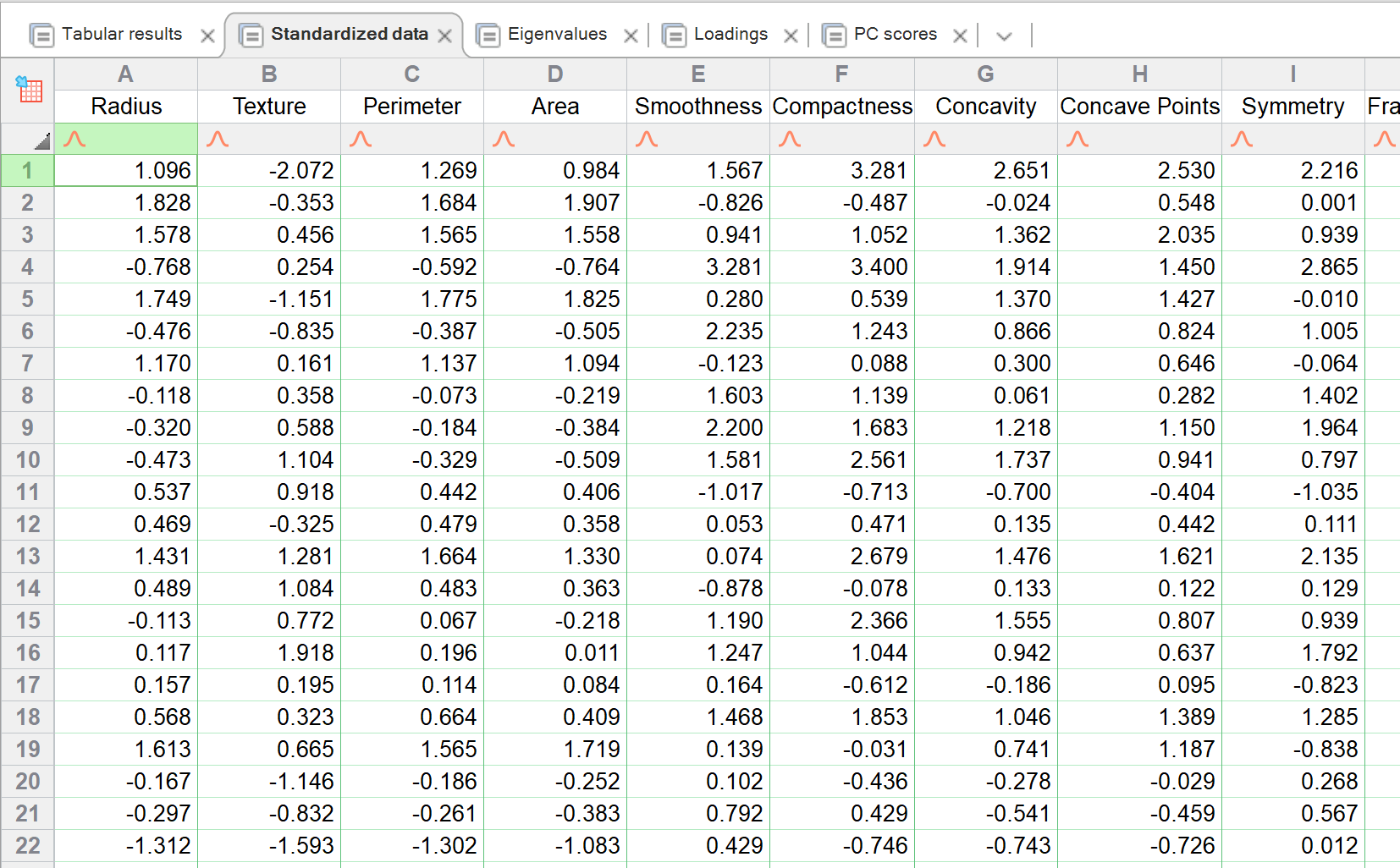 In the options tab of the PCA dialog, you chose to run PCA on standardized (centered and scaled) or centered data. This optional tab shows these values, which are the inputs to the PCA calculations.