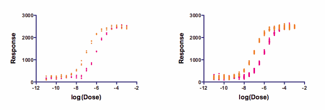 In contrast, for the graph on the right, the difference first became statistically significant when the log(concentration) was -9. Concentrations between those two values (between 1nM and 10nM) caused a statistically significant effect in the right graph, but not the left.