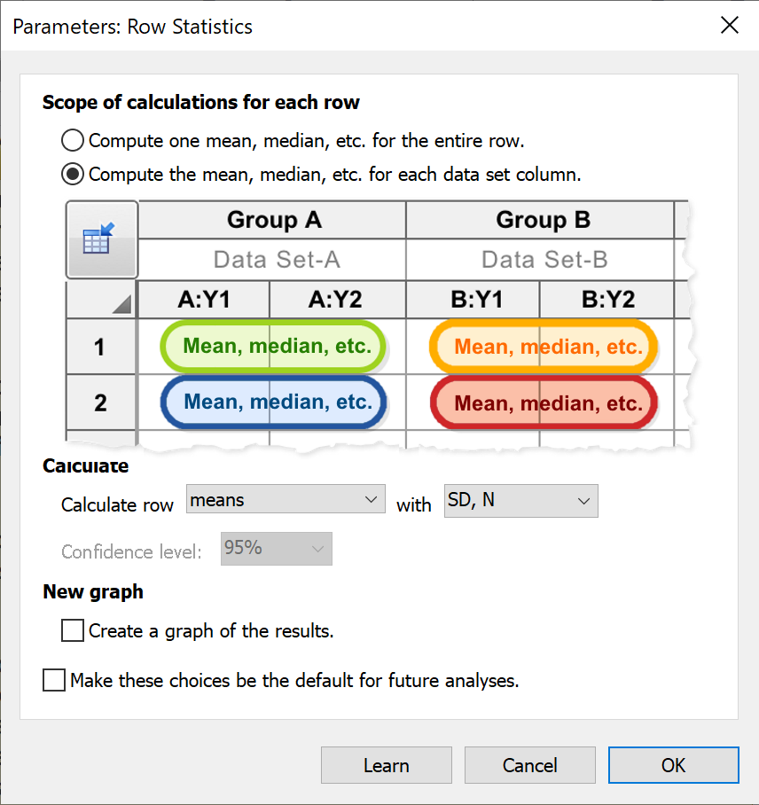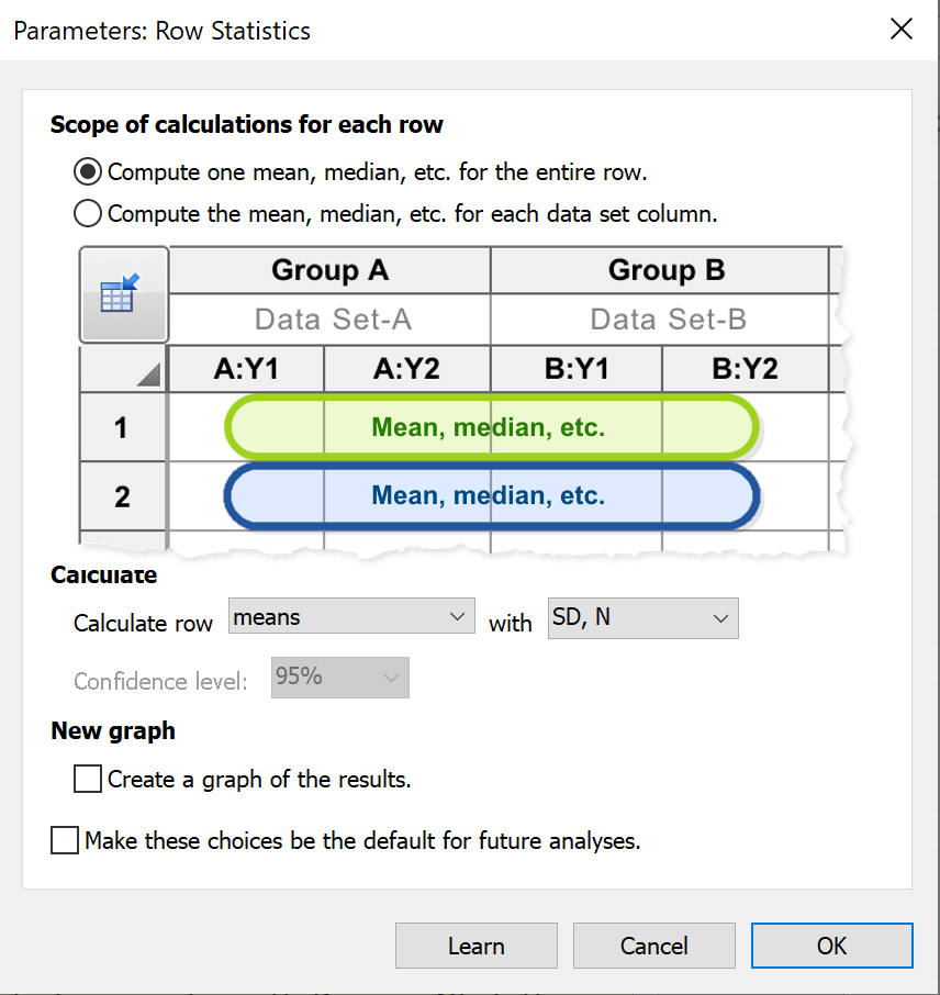 When data are entered into data sets that contain subcolumns, this option will instruct Prism to calculate a separate mean (or median, total, etc.) for each row within each data set. Note that you do not need to perform this analysis manually in order to graph the means or errors of your data, as Prism will handle this automatically when creating graphs of your data (you can use the Format Graph dialog to specify if Prism should display individual points or error bars for SD, SEM, 95% Confidence Intervals, or range). The primary purpose of this analysis is simply to generate a table of these summary (mean, median, etc.) and error (SD, SEM, etc.) values.