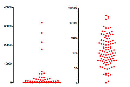 •When plotted on a logarithmic axis, as shown on the right panel of the graph above, the distribution is symmetrical.