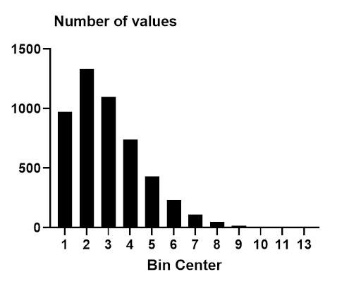 A large portion of the survival times are found between times 1 and 3 (almost 70% of the observed survival times fall into this range). However, there were multiple observations as far out as time 13. These values on the right-hand side of the histogram are said to give the distribution a “large right tail” or that the distribution is “right-skewed”. These data are simulated, but show the characteristics of a right-skewed distribution that is often observed in real survival data. Because of this skew, many of the assumptions and techniques relying on a normal (Gaussian) distribution cannot be used.