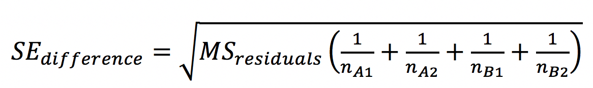 •The standard error of the difference is computed using the equation below, where MSresiduals is the mean square of the residuals reported in the ANOVA table, and the four n values are the four sample sizes.