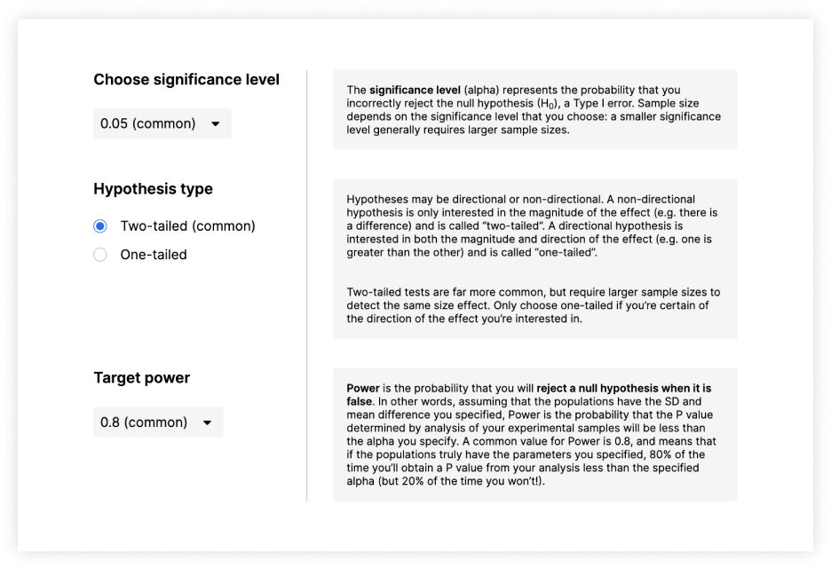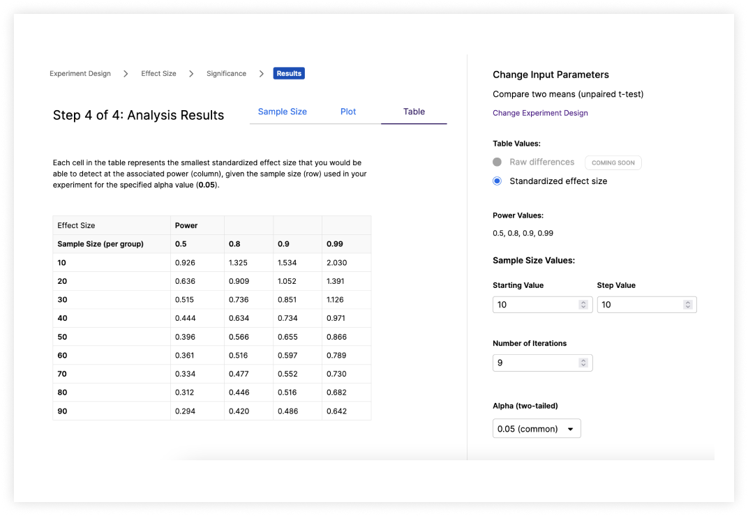 Fully adjustable parameters to calculate key values. Determine the sample size needed to detect a predicted effect size, or find the smallest detectable effect size when working with a limited sample size.