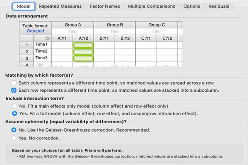 By asking relatable, jargon-free questions, Prism makes choosing the correct ANOVA model simple and transparent.