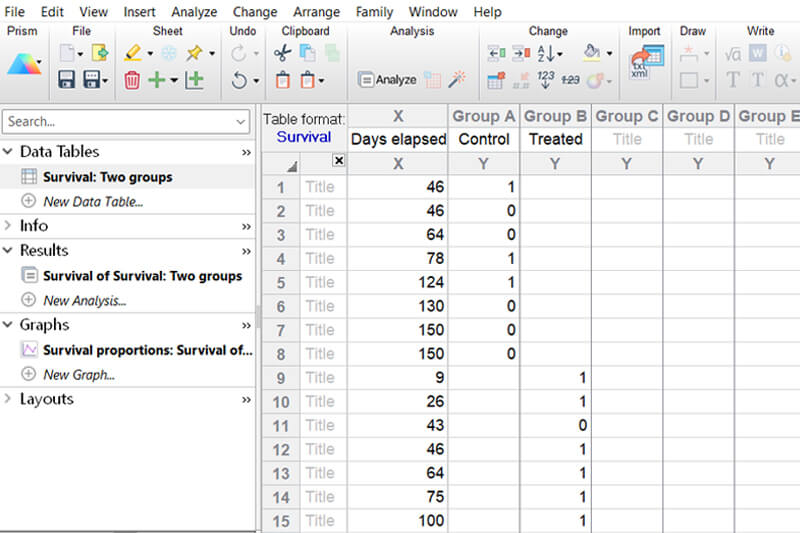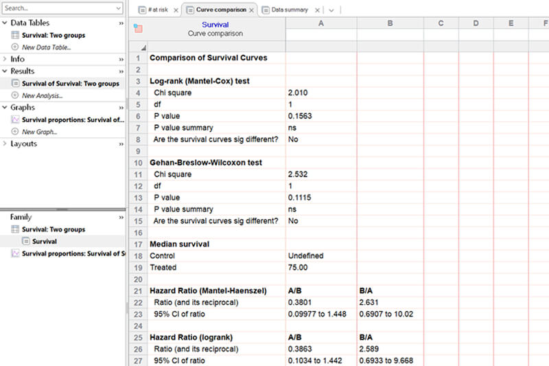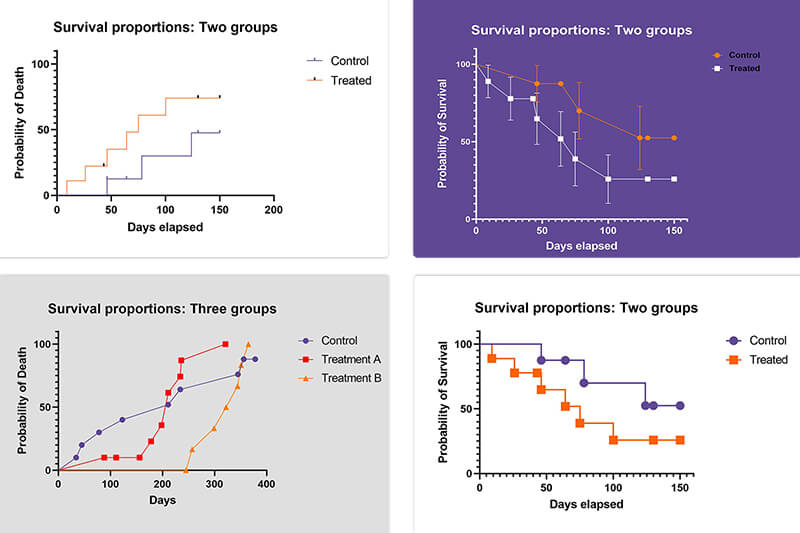Prism is purpose-built for scientists to easily perform Survival Analysis, which estimates the lifespan of a population over the timespan of an experiment. More specifically, Survival curves graphically represent the data collected in these experiments, showing the relationship between elapsed time and survival probability. If survival curves for different groups or populations have been generated (using the Kaplan-Meier estimation method), these can be compared using the log rank test.