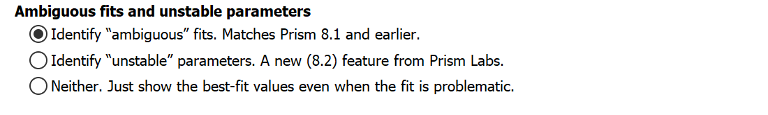 Starting with Prism 8.2, we offer a number of choices regarding how Prism should handle cases when the chosen model isn't fully defined by the available data. These options are to identify "ambiguous" fits, to identify "unstable" parameters, or to do neither. Prior to Prism 8.2, Prism would always identify "ambiguous" fits. We've found that the option to identify "unstable" parameters seems to work better, but we offer these all of these options as choices, so you can get results that match prior versions. The choice is in the Confidence tab of the nonlinear regression dialog.