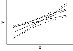 The dashed confidence bands are curved. This does not mean that the confidence band includes the possibility of curves as well as straight lines. Rather, the curved lines are the boundaries of all possible straight lines. The figure below shows four possible linear regression lines (solid) that lie within the confidence band (dashed).
