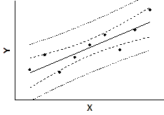 Prism can also plot the 95% prediction bands. The prediction bands are further from the best-fit line than the confidence bands, a lot further if you have many data points. The 95% prediction band is the area in which you expect 95% of all data points to fall. In contrast, the 95% confidence band is the area that has a 95% chance of containing the true regression line. This graph shows both prediction and confidence intervals (the curves defining the prediction intervals are further from the regression line).