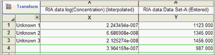 From the Welcome or New Table dialog, choose to create an XY data table, and select the sample data set: RIA or ELISA. Interpolate unknowns from sigmoidal curve.