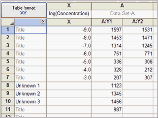 The first seven rows contain the standard curve, in duplicate. Below that are three unknown values. These have a Y values that you measured, but no X. The goal of this analysis is to interpolate the corresponding X values (concentrations) for these unknowns. Note that three of the four unknowns are labeled, so you can later match up the results with the labels.