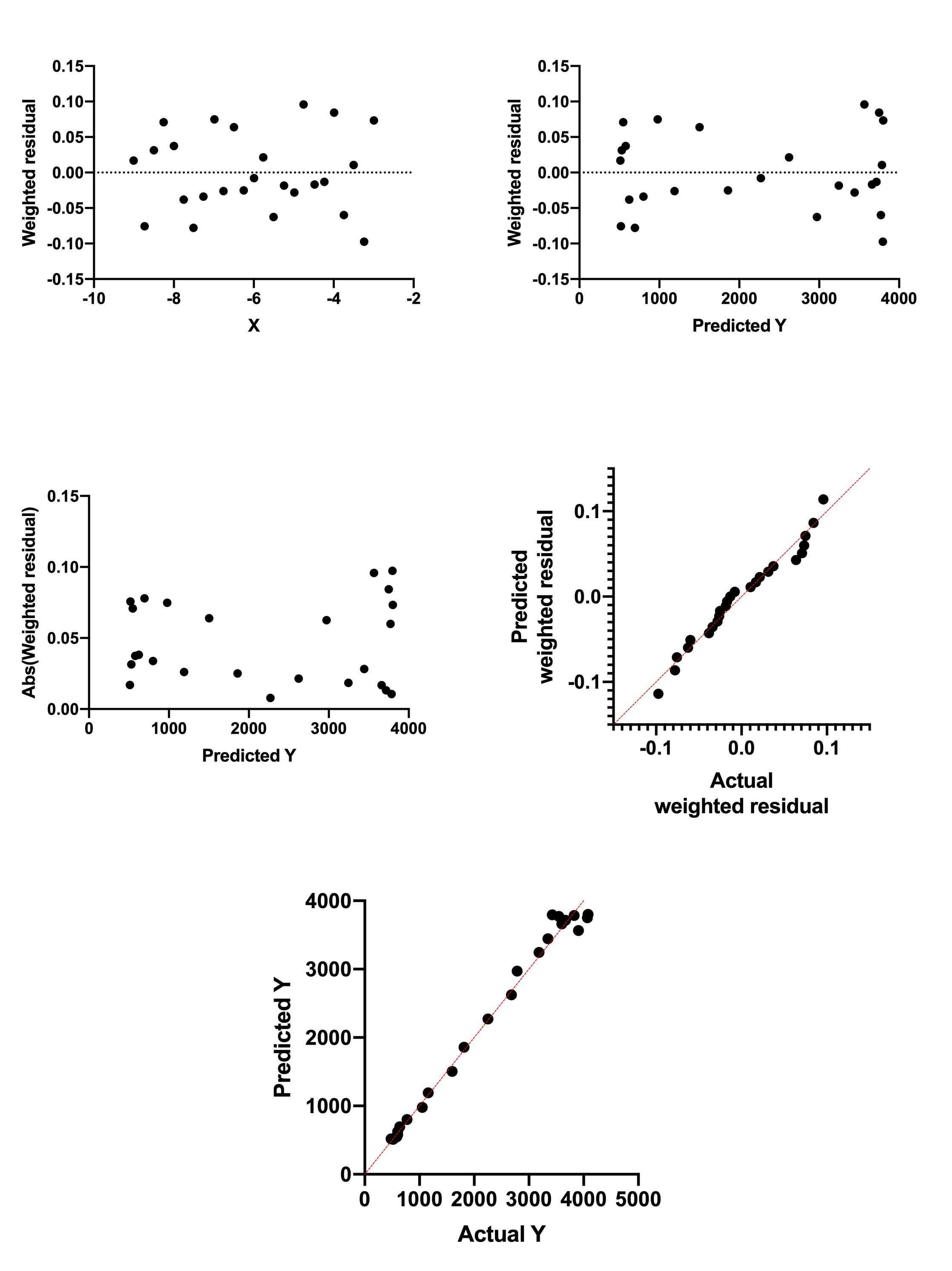 The data were then fit to the same model but with relative weighting. Here are the fivea residual graphs. All show that the data now comply with the assumption of the fit.