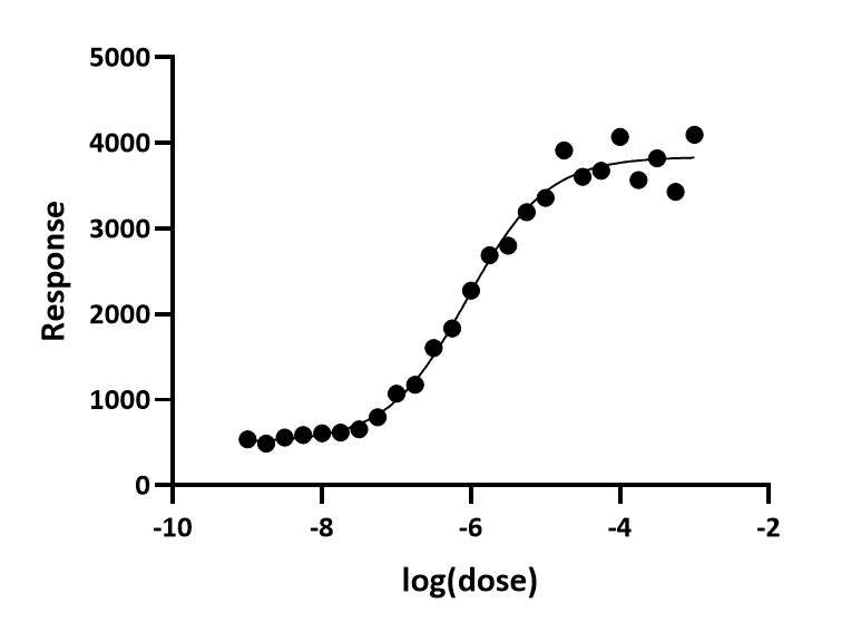 Here is a log(dose) vs. response curve with simulated data. The random scatter was chosen so the points with larger Y values have larger average scatter. The fit was done the usual way without weighting. If you look carefully, you can see that the points at the top of the curve have more scatter, but it isn't so obvious.