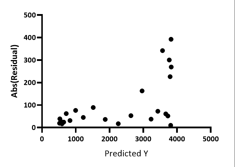 This graph is made just like the graph of predicted Y vs. residuals, except here the absolute values of the residuals are shown. Now it is really clear that the residuals get larger as Y gets larger.