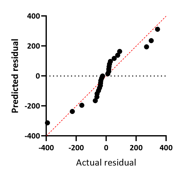 This graph doesn't directly plot the residual of the fit on either axis. Instead, this graph plots the actual Y value (entered in the data table) on the X axis, and the Predicted Y value on the Y axis. This graph is commonly used for assessing the fit of simple linear regression (and Prism also generates this graph for multiple linear regression), but is not common for use in nonlinear regression. In this case, the residual is represented by the vertical distance between the plotted point and the red line of identity (the horizontal distance can also be used as these distances will always be the same for each point).
