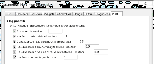 In the Flag tab, define the attributes that define poor fits you wish to flag. You can choose to flag a fit with any or all of the following attributes: low R2, too few data points, too high a dependency for any parameter, a failed normality test of residuals, a failed runs or residual test, or too many outliers.