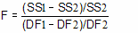 F ratios are always associated with a certain number of degrees of freedom for the numerator and a certain number of degrees of freedom for the denominator. This F ratio has DF1-DF2 degrees of freedom for the numerator, and DF2 degrees of freedom for the denominator.