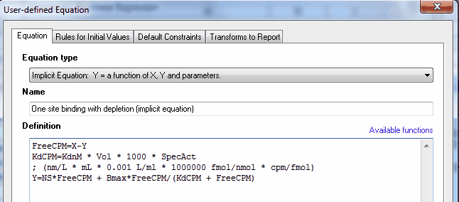 What if a substantial fraction of the ligand binds? A much more complicated model is built into Prism to handle this situation. But in other similar situations, the model may not have been derived and it may be very difficult or even impossible to derive one. Implicit equations to the rescue.