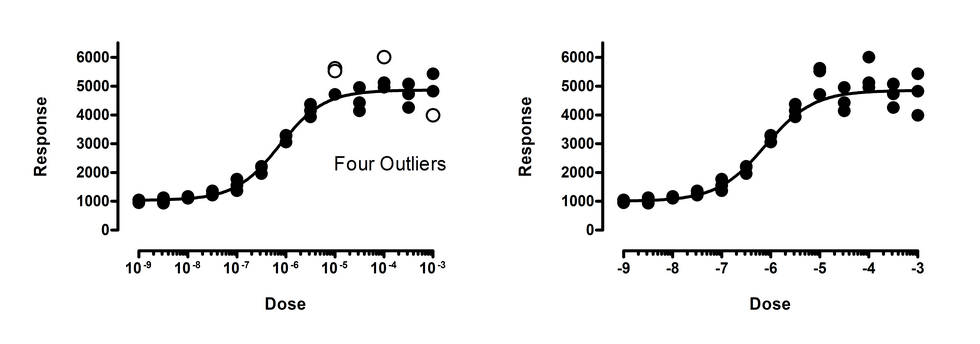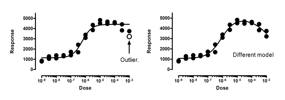 The left panel above shows the data fit to a dose response curve. In this figure, one of the points is a significant outlier. But this interpretation assumes that you’ve chosen the correct model. The right panel shows the data fit to an alternative bell-shaped dose-response model, where high doses evoke a smaller response than does a moderate dose. The data fit this model very well, with no outliers detected (or even suspected).