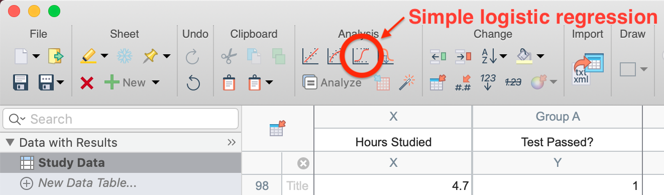 To perform simple logistic regression on this dataset, click on the simple logistic regression button in the toolbar (shown below). Alternatively, you can click on the "Analyze" button in the toolbar, then select "Simple logistic regression" from the list of available XY analyses.