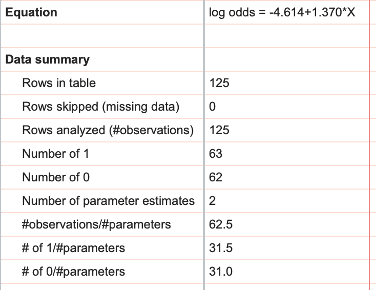 The final pieces of information that Prism provides from simple logistic regression include the model equation (given in terms of log odds), and a data summary that includes the number of rows in the data table, the number of rows that were skipped, and the difference of these two values providing the number of observations in the analysis. Additionally in the data summary, the total number of 1s and the total number of 0s is given. Finally, three ratios are provided: number of observations to number of parameters, number of 1s to number of parameters, and number of 0s to number of parameters (we recommend that these last two ratios should be at least 10 for logistic regression).