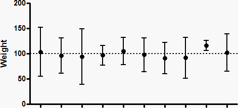 The upper panel below shows ten sets of data (N=5), randomly drawn from a Gaussian distribution with a mean of 100 and a standard deviation of 35. The lower panel shows the 95% CI of the mean for each sample.