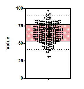 If the data are sampled from a Gaussian distribution, then you expect 68% of the values to lie within one SD of the mean and 95% to lie within two SD of the mean. This figure shows 250 values sampled from a Gaussian distribution. The shaded area covers plus or minus one SD from the mean, and includes about two-thirds of the values. The dotted lines are drawn at the mean plus or minus two standard deviations, and about 95% of the values lie within those limits.
