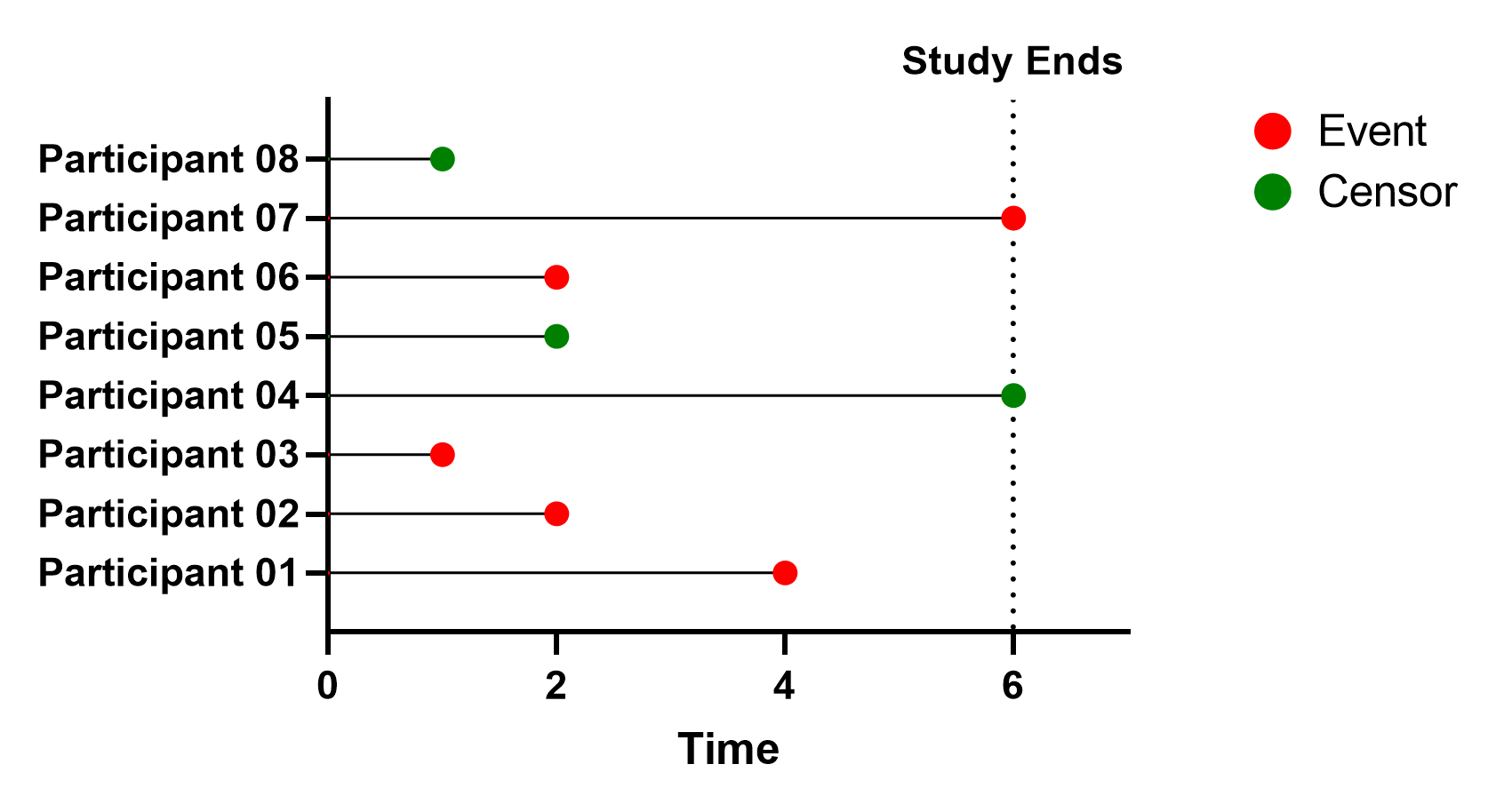 The graph below shows a timeline for each of the original 8 participants in the study, along with an indication of whether or not they died (event) or were censored.