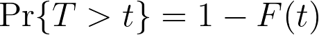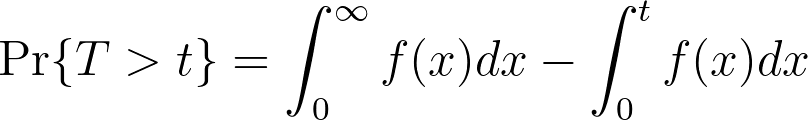 In other words, F(t) gives the probability that the observed elapsed time T is less than the specific time t being evaluated in the expression. However in survival analysis, we’re generally not interested in the probability that the event has occurred by a specific time. Rather, we would like to know the probability that the event has not occurred by a specific time. We can use a few of the facts presented earlier about the pdf and the cdf to give this mathematical form.