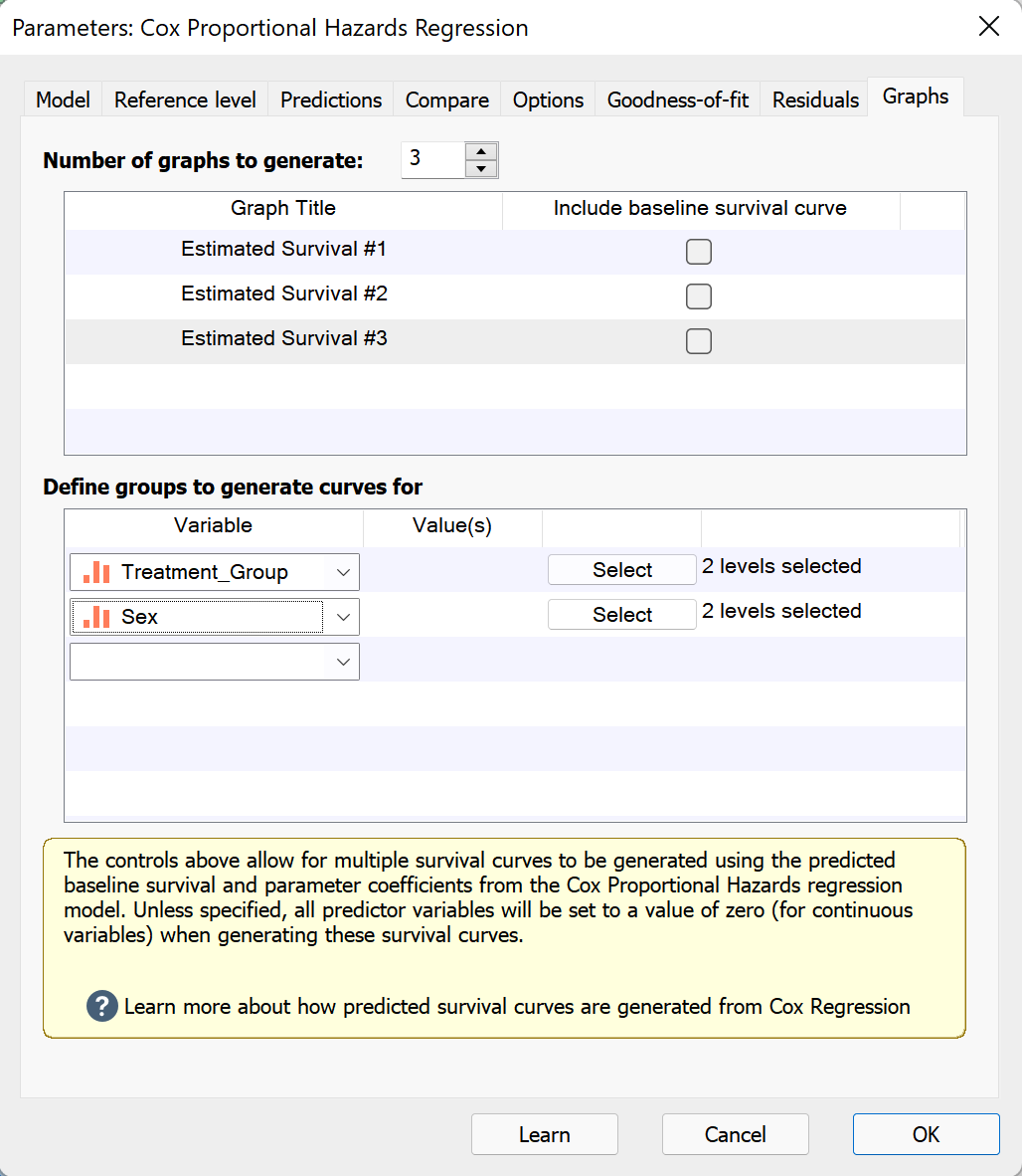 When a graph is added, there is an option to include the baseline survival curve on each graph. This is the same curve that is reported on the “Baseline functions” results sheet. We won’t enable this option for this example. Selecting each of the graphs in the upper box, we can then specify the variables that we’d like to include on each in the “Define groups to generate curves for” section below. With “Estimated Survival #1” selected in the upper box of the dialog, we’ll use the dropdown menu in the lower box of the dialog to select the “Treatment_Group” variable. By default, all levels of a categorical variable are included when the variable is selected. To confirm that we have both the “Control” and “Treatment” levels selected, we can click the “Select” button to see a list of all levels available for the specified variable.