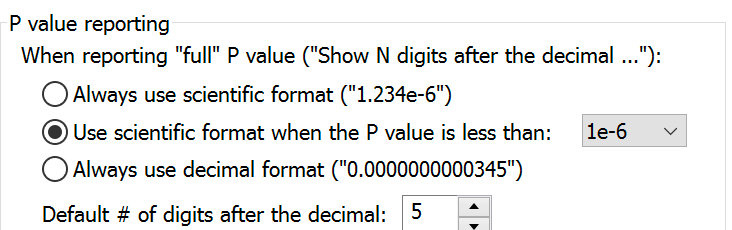 Every analysis that reports P values lets you choose the decimal format used to report P values. Each analysis that computes P values gives you these choices: