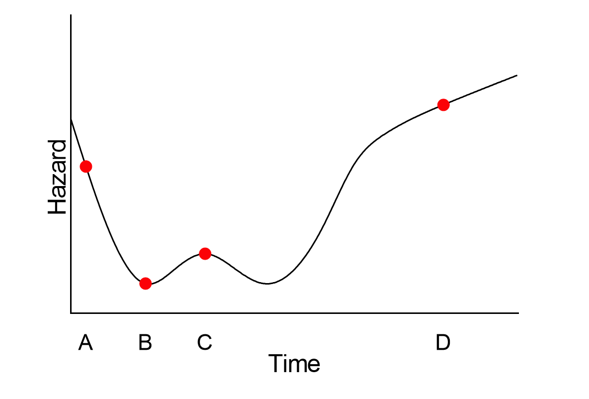 In this graph, the hazard starts somewhat high, then decreases for the first bit of time. It then increases to a small peak and decreases again, before finally increasing at different rates through the end of the observation period. The interpretation of this graph is that the risk of experiencing the event at time point A is higher than at B; the risk of experiencing the event at time C is lower than A, but higher than B; and the risk at D is higher than at A, B, or C.