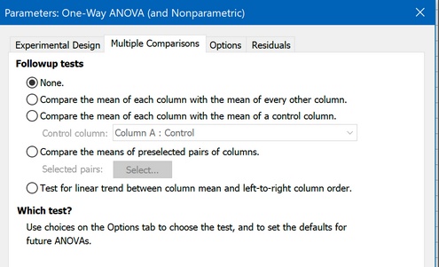 •The Multiple Comparisons tab specifies the questions you want the multiple comparisons tests to answer. This decision depends on the experimental design and will vary from experiment to experiment.