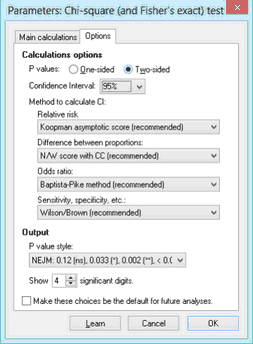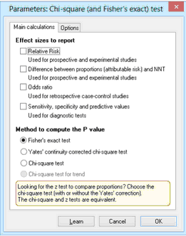 If your table has two rows and two columns, we suggest you always choose Fisher's exact test to calculate the P value.