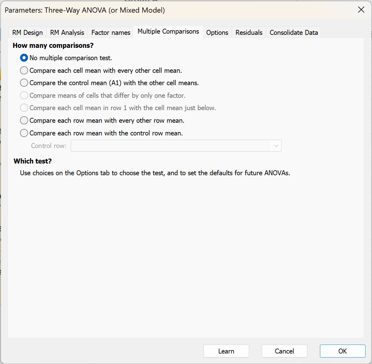 In many cases, the answers you really want are determined by multiple comparisons and not by the overall ANOVA analysis. Choose the comparisons you want to make on this tab, and then set the details on the next (Options) tab.