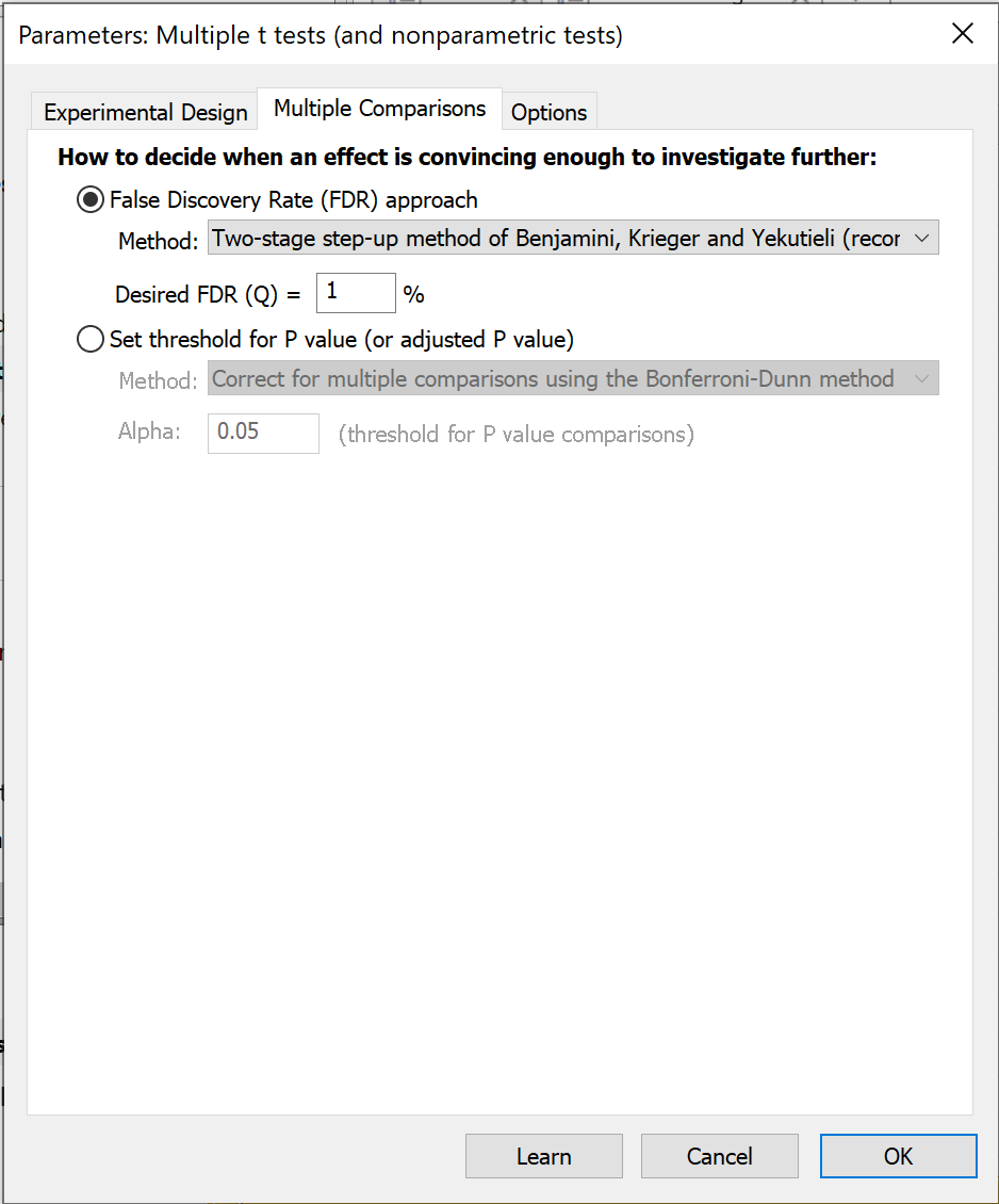 Prism provides a number of important options for the multiple t test (and nonparametric tests) analysis, allowing you to choose from one of numerous different tests to perform for each row of the data table.