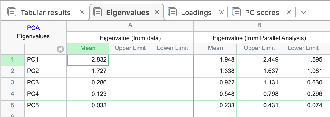 The next tab of the results includes the eigenvalues calculated from the data as well as the mean eigenvalues and percentiles (5th and 95th) calculated from parallel analysis. Note that the first two PCs had eigenvalues (from the data) that were greater than the upper limit (95th percentile) of eigenvalues calculated by parallel analysis, and so those PCs were selected