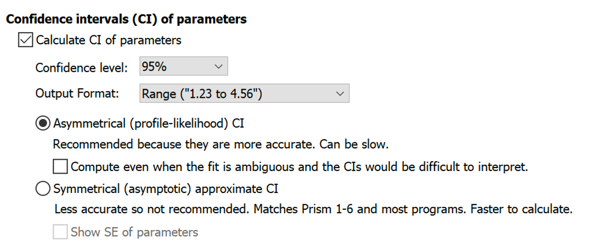 •Asymmetrical (and thus more accurate) profile likelihood confidence intervals. We recommend this choice because it simply does a better job of quantifying how precisely you know the parameters value. The uncertainty often is asymmetrical, so it is better to use a method that can report asymmetrical intervals. The only disadvantage is that the calculations are more complex so are noticeably slower with huge data sets (especially with user-defined equations).