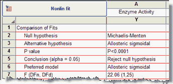 The top part of the results summarizes the comparison. The P value is low, suggesting that the simpler (Michaelis-Menten) model is too simple and should be rejected. The allosteric model fits significantly better.