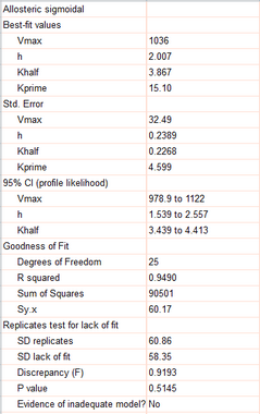 The parameter H equals 2.0, with a 95% confidence interval ranging from 1.5 to 2.5. A value of 2.0 suggests that this enzyme might be a dimer. When H equals 1.0, the allosteric model is identical to the Michaelis-Menten model.