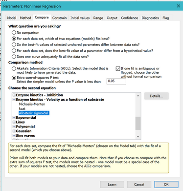 There are two ways to compare models. For this example, choose the extra sum-of-squares F test.