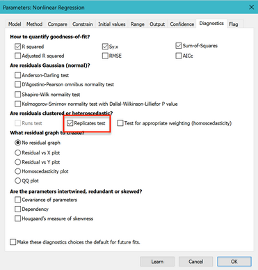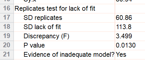 The replicates test assesses the adequacy of the fit by comparing the scatter among the triplicates with the scatter of points around the curve. It is not calculated by default, so the results do not appear in the results of step 7.