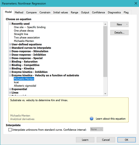 On the Fit tab of the nonlinear regression dialog, open the equation folder, Enzyme Kinetics - Substrate vs. Velocity. Then choose the Michaelis-Menten equation.