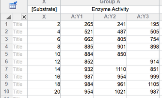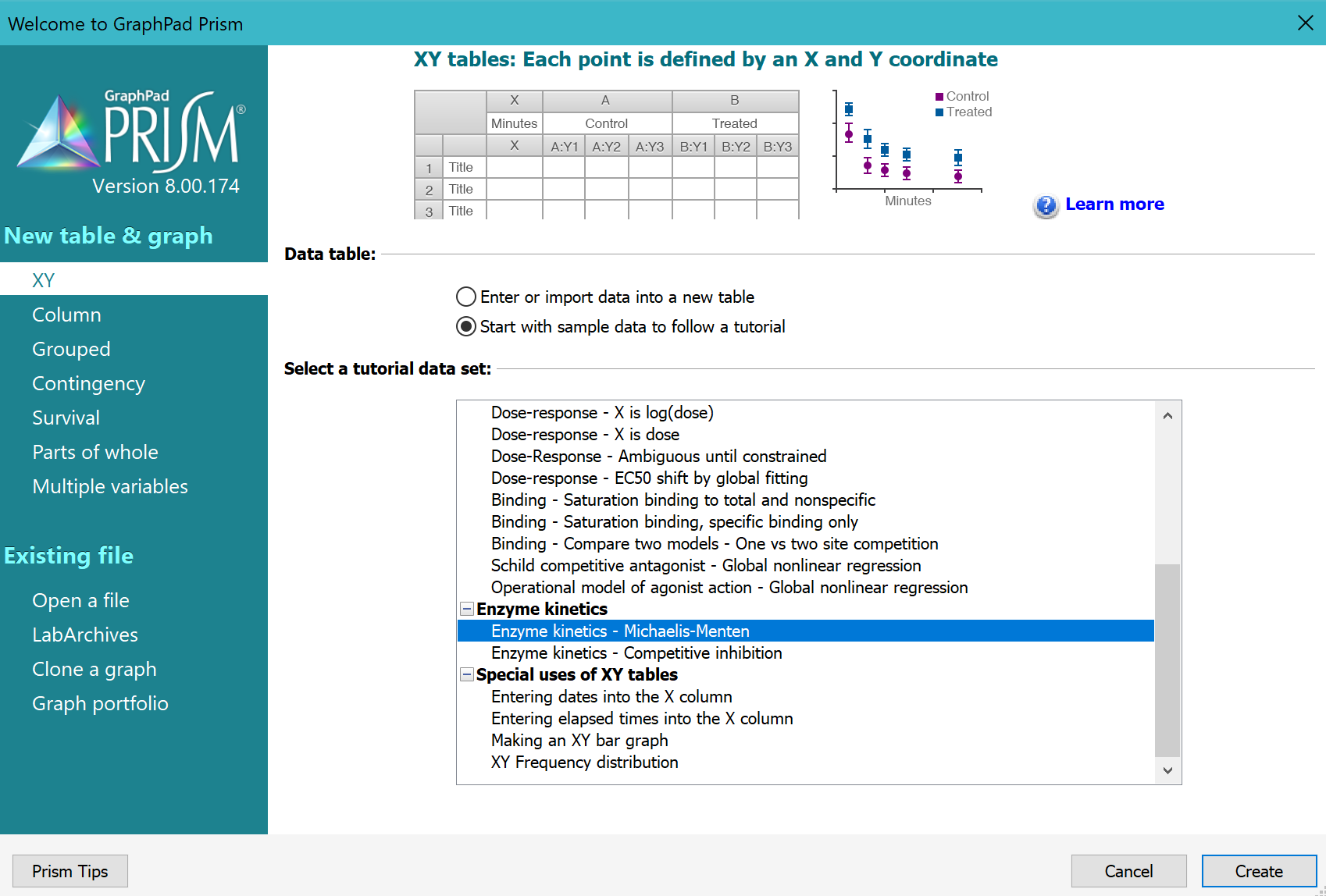 From the Welcome or New Table dialog, choose to create an XY data table, choose tutorial data sets, and select the sample data "Enzyme kinetics -- Michaelis-Menten" from the enzyme kinetics section.