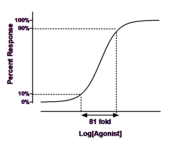Many dose-response curves follow the shape of a receptor binding curve. As shown below, 81 times more agonist is needed to achieve 90% response than a 10% response.