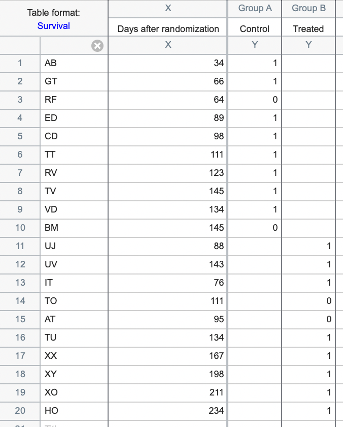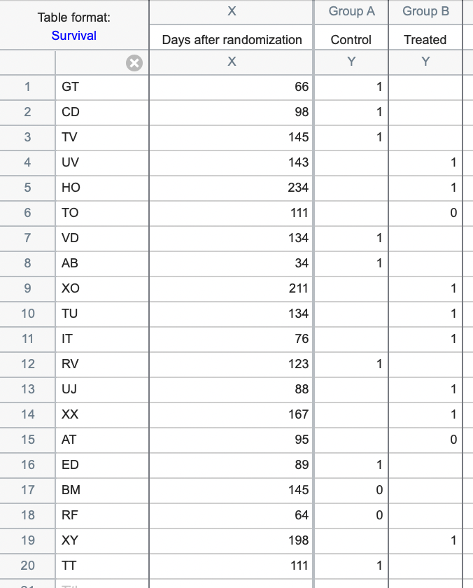 However, note that there’s no reason that the groups have to be separated this way. As long as the correct elapsed time is associated with the correct outcome (1 or 0) in the correct group (column) on the same row, the analysis results will be the same. For example, the data above, could also be entered like this: